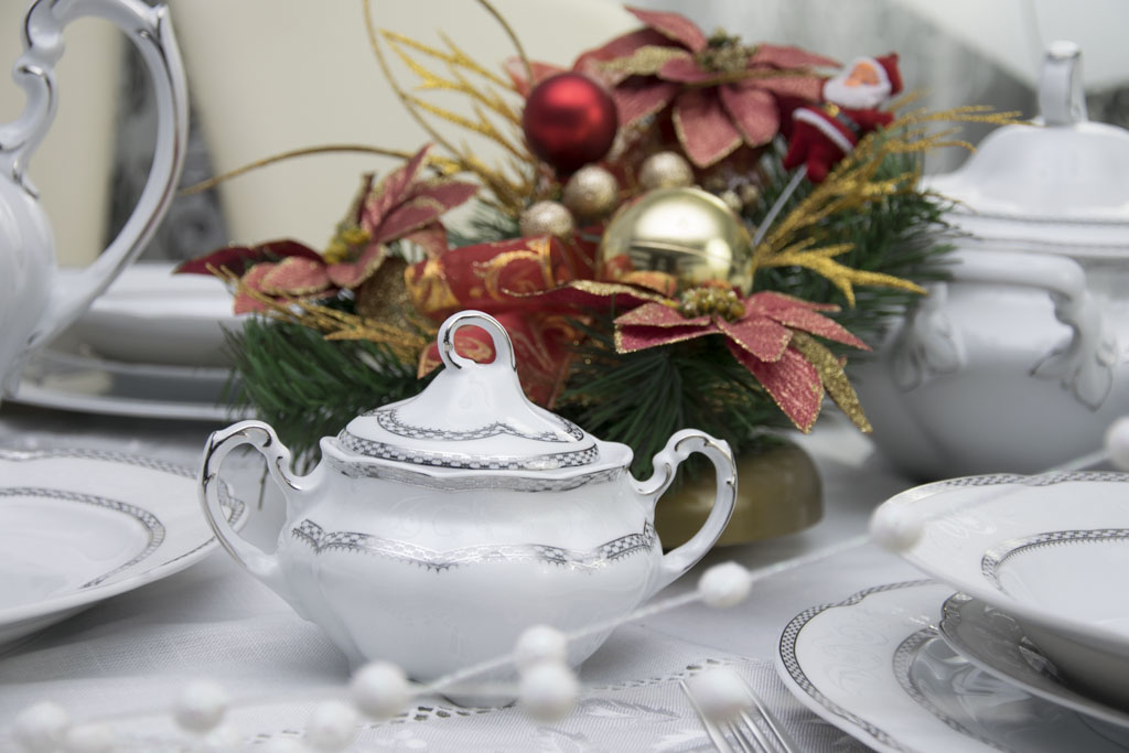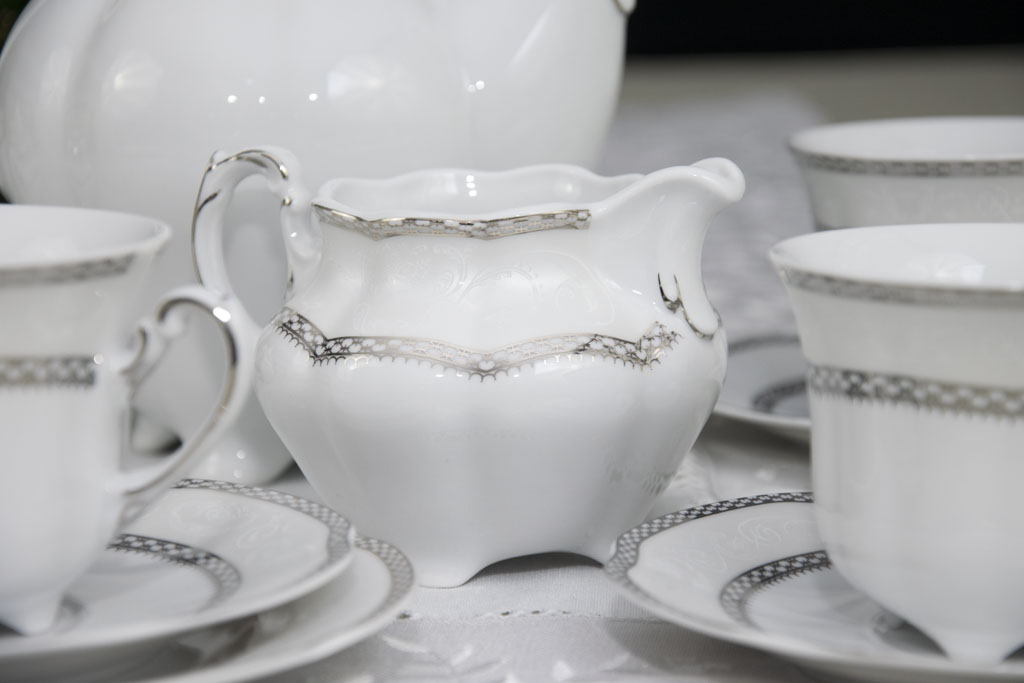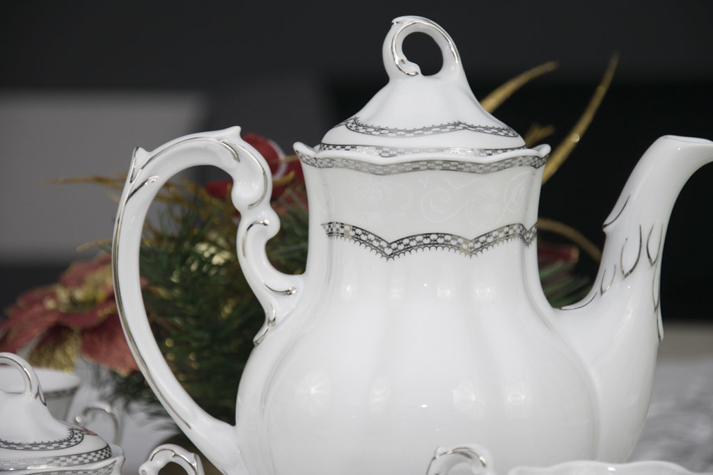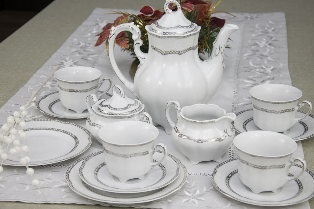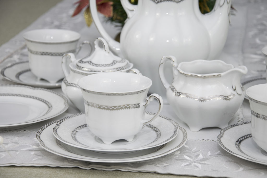Zestaw składa się aż z 37 elementów a na jego wyposażeniu znajdą Państwo talerzyki deserowe. Kształt filiżanki w tym wariancie jest typowy dla picia kawy. Całość zamyka pojemny imbryk oraz cukiernica z mlecznikiem o nietuzinkowym kształcie.